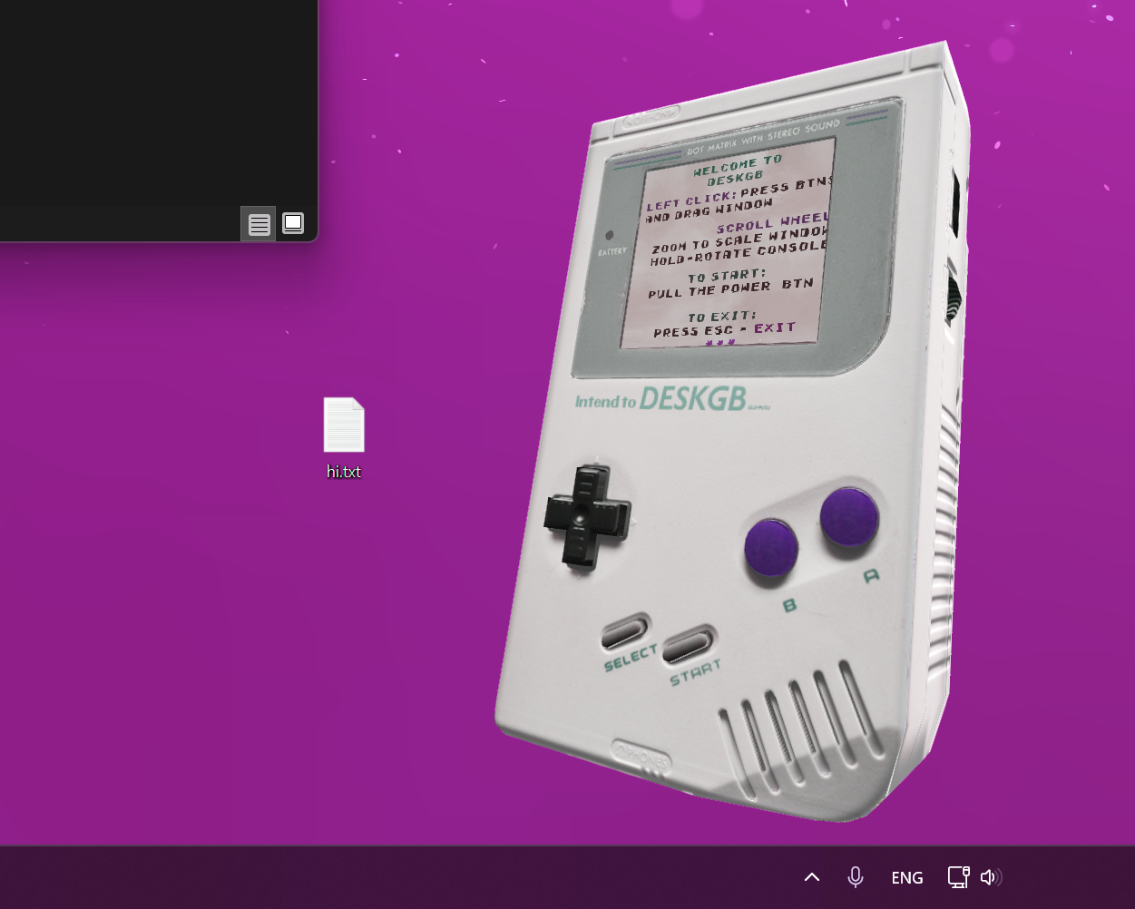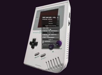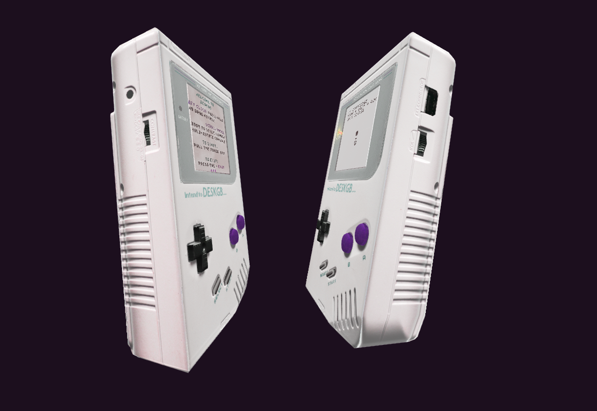 DeskGB is an interactive desktop device inspired by classic handheld consoles. Press its buttons, rotate it, and put it anywhere you want. All with the click of your mouse! Instantly load your .gb. or .gbc files by pulling them on top of DeskGB.